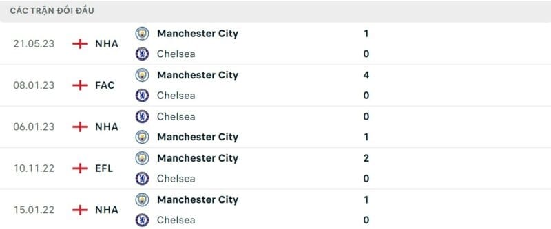 Thành tích đối đầu Chelsea vs Man City: