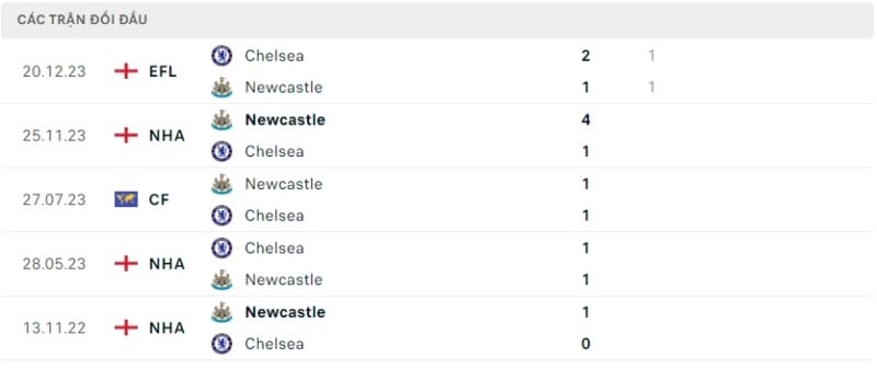 Câu lạc bộ Newcastle không có thành tích đối đầu tốt trong quá khứ trước Chelsea. Nhưng trong 2-3 mùa giải gần đây, họ lại chơi rất hay mỗi lần gặp The Blues. Trong 5 cuộc đụng độ gần nhất, Chích chòe đã thắng 2, hòa 1 và để thua 1 lần trong loạt luân lưu đầy may rủi.