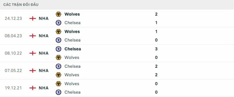 Thành tích đối đầu Chelsea vs Wolves