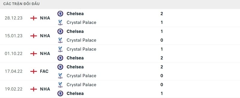 Thành tích đối đầu Crystal Palace vs Chelsea: