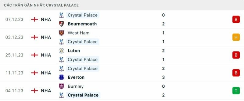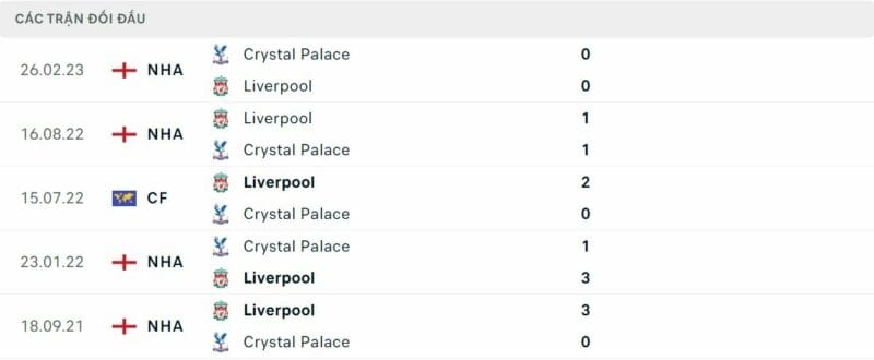 Thành tích đối đầu Crystal Palace vs Liverpool