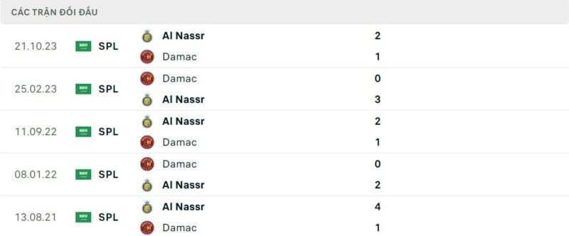 Thành tích đối đầu Damac vs Al Nassr