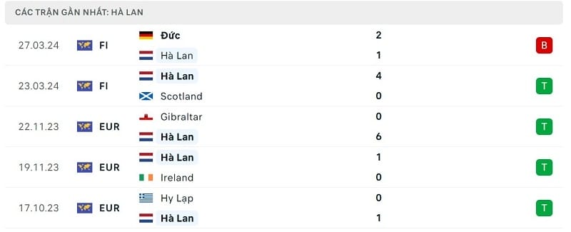 Hà Lan đã có màn thể hiện khá tốt tại vòng loại Euro 2024. Ngoại trừ hai trận thua trước đối thủ được đánh giá cao hơn là Pháp, đoàn quân của HLV Ronald Koeman đã toàn thắng 6 trận đấu còn lại. Nhờ đó, ĐT Hà Lan giành vé đến VCK Euro 2024 với ngôi nhì bảng B.
