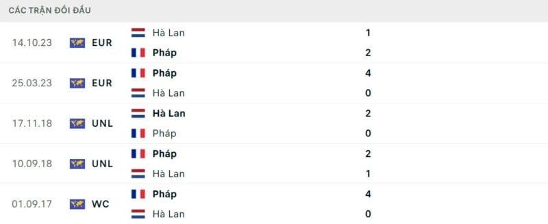 Thành tích đối đầu Hà Lan vs Pháp