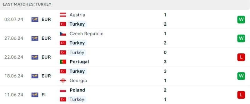 Phong độ gần đây Hà Lan vs Thổ Nhĩ Kỳ