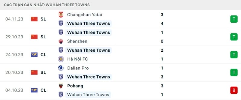 Trong khi đó, Wuhan Three Towns đang thể hiện phong độ khá tốt với 4 thắng và 1 thua sau 5 trận gần nhất. Riêng ở AFC Champions League, CLB Trung Quốc giành 4/9 tối đa và xếp vị trí thứ 3. Do còn phải đụng độ 2 đại diện Nhật Bản và Hàn Quốc, Wuhan Three Towns sẽ càng muốn đánh bại Hà Nội để tranh thủ tích góp điểm số.