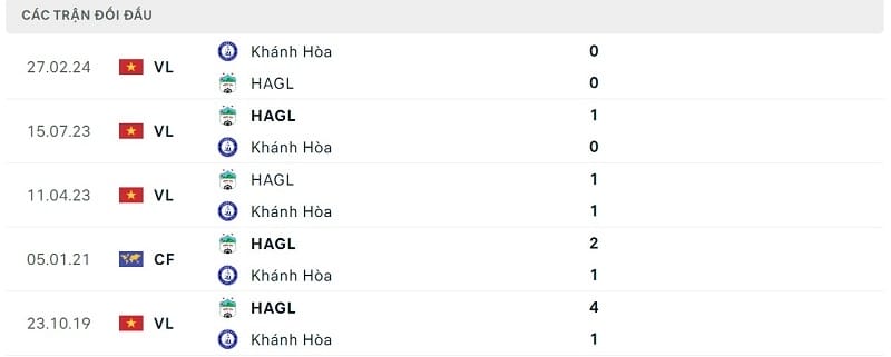 Thành tích đối đầu HAGL vs Khánh Hòa