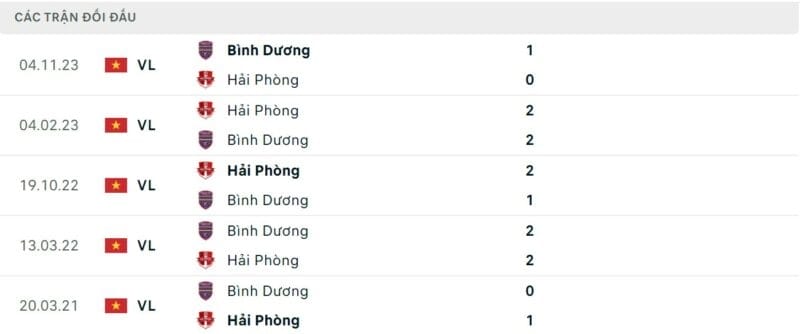 Thành tích đối đầu Hải Phòng vs Bình Dương