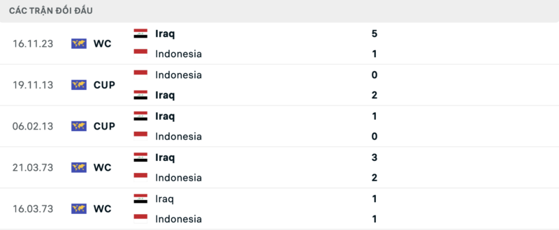 Thành tích đối đầu Indonesia vs Iraq