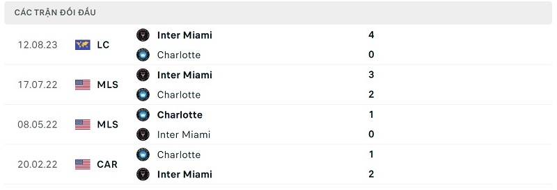 Thành tích đối đầu Inter Miami vs Charlotte: