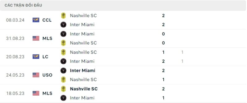 Thành tích đối đầu Inter Miami vs Nashville