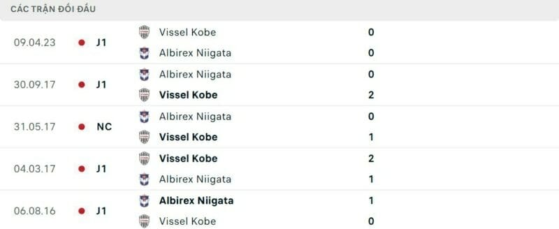Thành tích đối đầu Albirex Niigata vs Vissel Kobe: