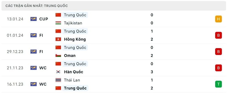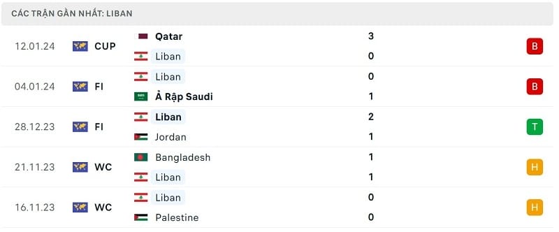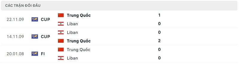 Thành tích đối đầu Lebanon vs Trung Quốc: