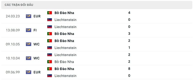 Thành tích đối đầu Liechtenstein vs Bồ Đào Nha: