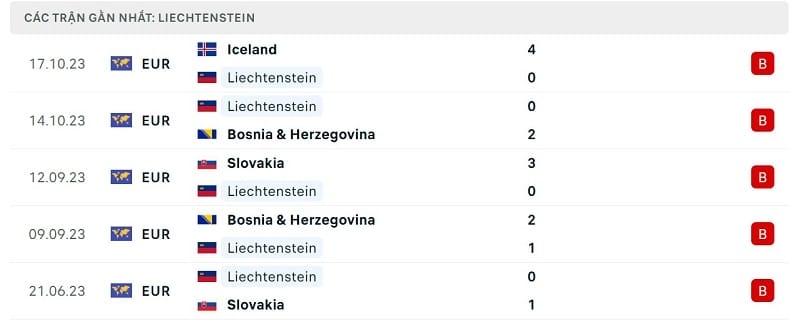 Ngay từ khi có kết quả bốc thăm vòng loại Euro 2024, ĐT Liechtenstein đã bị coi là đội bóng “lót đường” của bảng J. Tính đến thời điểm hiện tại, nhận định đó hoàn toàn chính xác. Sau 8 trận đấu, đoàn quân của HLV Konrad Funfstuck toàn thua, thủng lưới 25 lần và ghi được duy nhất 1 bàn thắng. Với thành tích tệ hại ấy, ĐT Liechtenstein dĩ nhiên là đội đứng bét bảng J với 0 điểm.