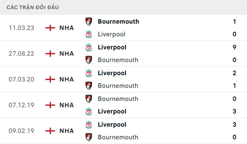 Thành tích đối đầu Liverpool vs Bournemouth