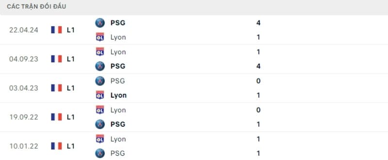 Thành tích đối đầu Lyon vs PSG