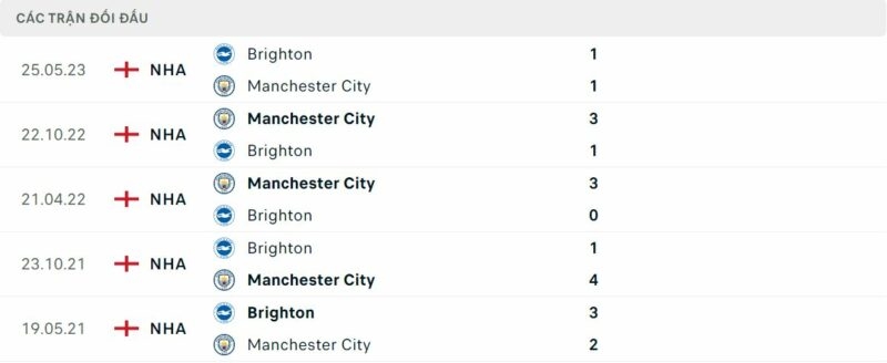 Thành tích đối đầu Man City vs Brighton