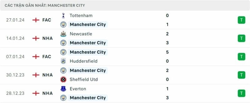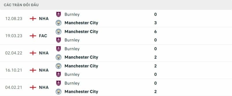 Thành tích đối đầu Man City vs Burnley