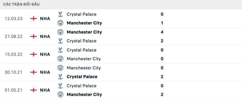 Thành tích đối đầu Man City vs Crystal Palace