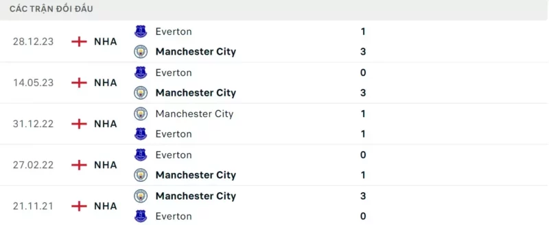 Thành tích đối đầu Man City vs Everton: