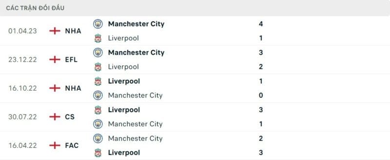 Thống kê chỉ ra rằng Liverpool chưa từng thắng trên sân Man City tại Ngoại hạng Anh kể từ năm 2015. Ở lần đối đầu gần nhất, The Cityzens đã hủy diệt đội khách với tỉ số 4-1. Thành tích đối đầu đáng quên càng khiến cho các CĐV The Kop lo lắng về một chuyến đi lành ít dữ nhiều tới thành phố Manchester vào cuối tuần này.