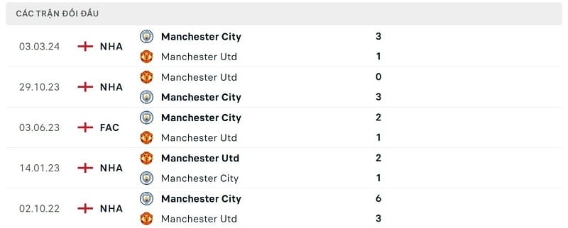 Thành tích đối đầu Man City vs Man United