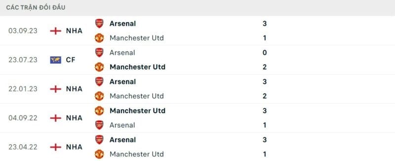 Thành tích đối đầu Man United vs Arsenal