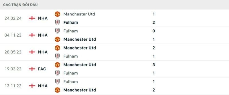 Thành tích đối đầu Man United vs Fulham
