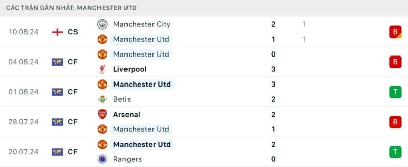Còn trên sân, thầy trò HLV Erik ten Hag đã thi đấu tổng cộng 5 trận giao hữu. Mặc dù vậy, kết quả của Quỷ đỏ chưa được như mong đợi. Họ chỉ thắng được 2 và thua tới 3 trận, trong đó có những thất bại trước các đối thủ mạnh như Arsenal và Liverpool.