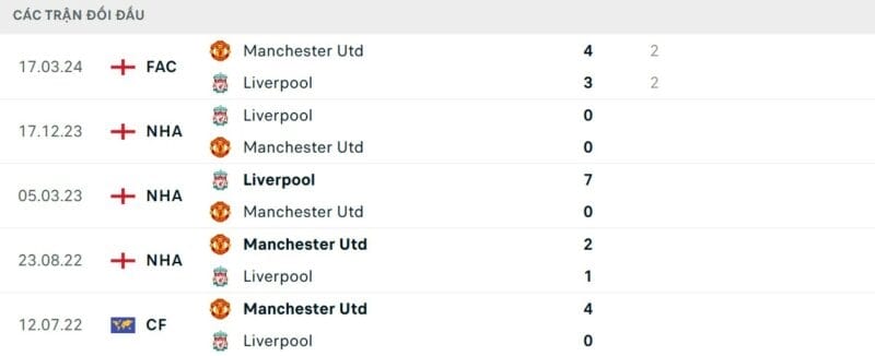Thành tích đối đầu Man United vs Liverpool
