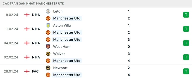 Kể từ khi bước vào năm 2024, sau 5 trận đầu tiên tại Premier League, Man Utd thắng 4 và hòa 1 trước Tottenham Hotspur. Điều đáng nói là 4 trận thắng đó diễn ra liền mạch bắt đầu từ ngày 02/02 đến vòng đấu cuối tuần rồi gặp Luton Town. Hiếm khi Quỷ đỏ cho thấy sự ổn định như thế trong mùa giải này. Họ vì thế chỉ đang kém vị trí thứ 4 của Aston Villa 5 điểm sau vòng 25.