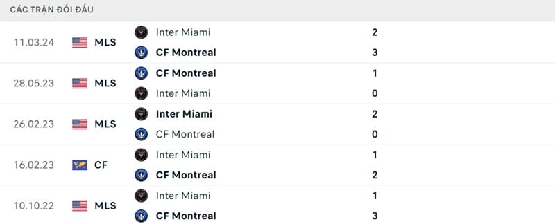 Thành tích đối đầu Montreal vs Inter Miami