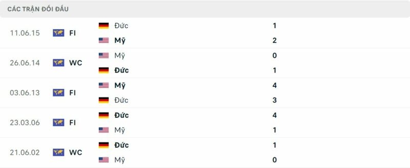 Thành tích đối đầu Mỹ vs Đức