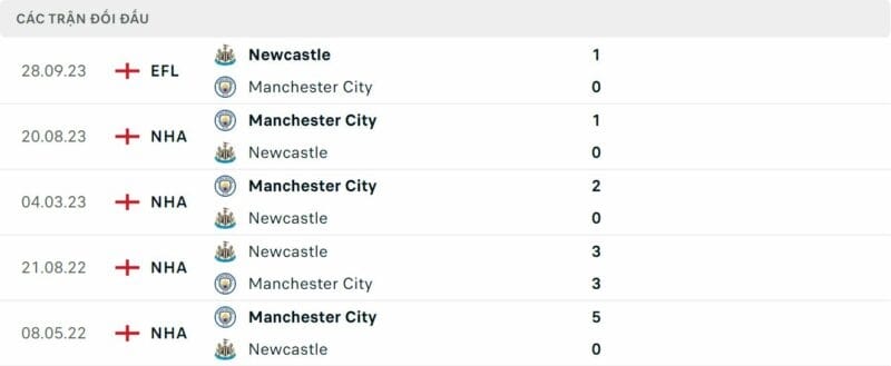 Thành tích đối đầu Newcastle vs Man City