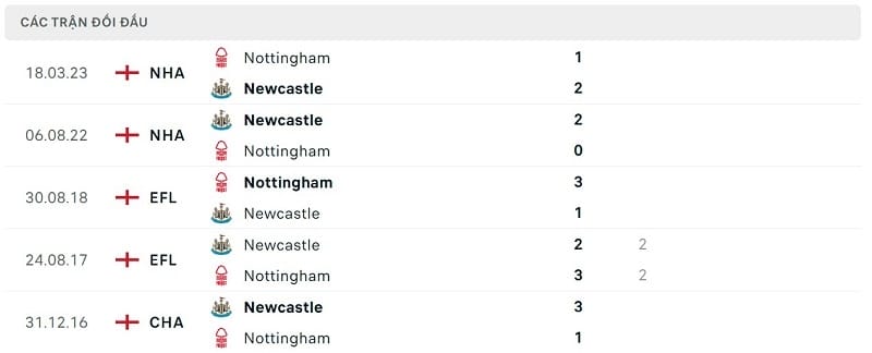 Thành tích đối đầu Newcastle vs Nottingham Forest: