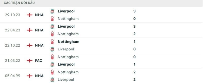 Thành tích đối đầu Nottingham Forest vs Liverpool: