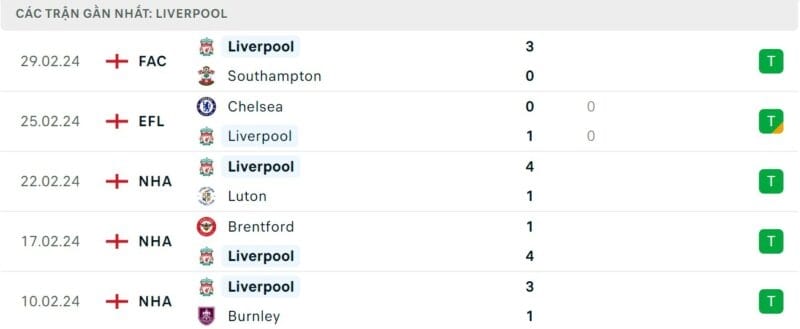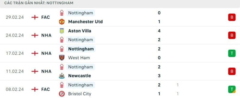 Phong độ gần đây Nottingham Forest vs Liverpool: