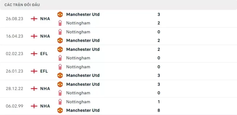 Thành tích đối đầu Nottingham vs Man United