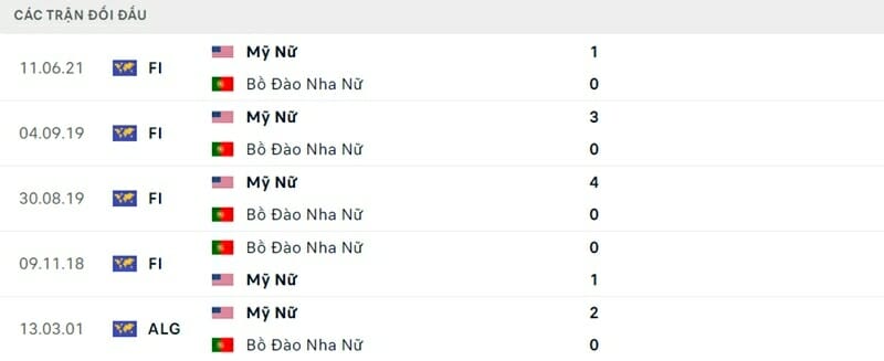 Thành tích đối đầu nữ Bồ Đào Nha vs nữ Mỹ