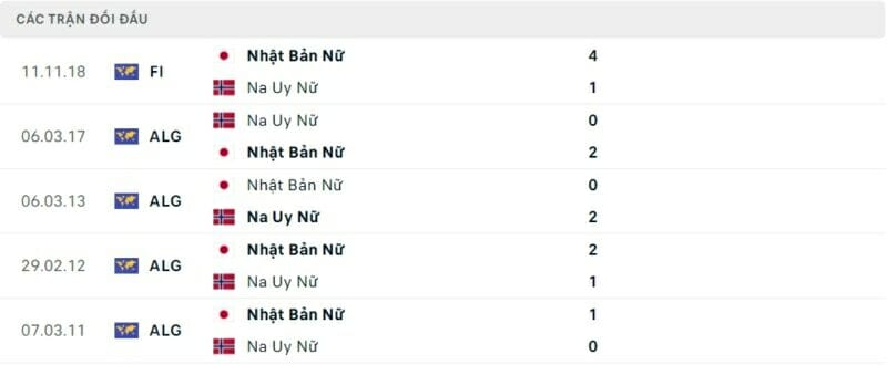 Thành tích đối đầu Nữ Nhật Bản vs Nữ Na Uy