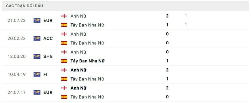 Thành tích đối đầu nữ Tây Ban Nha vs nữ Anh: