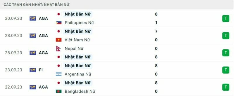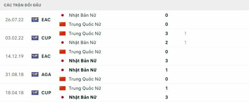Thành tích đối đầu Nữ Trung Quốc vs Nữ Nhật Bản