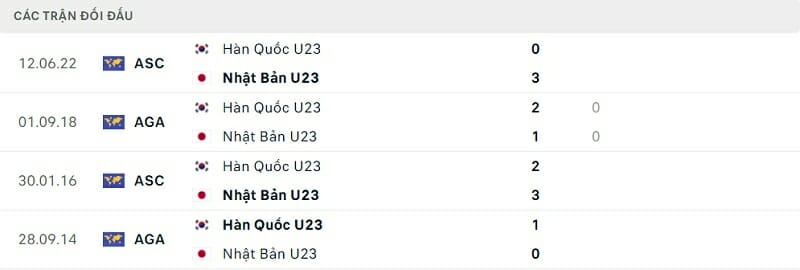 Thành tích đối đầu Olympic Hàn Quốc vs Olympic Nhật Bản