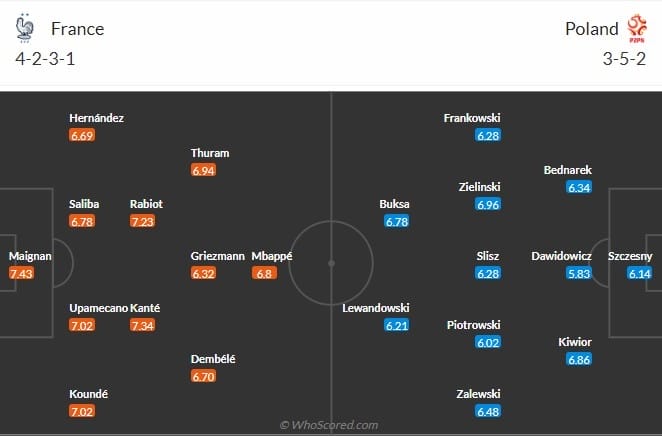 Pháp liên tục uy hiếp khung thành của Ba Lan khi những Ousmane Dembele hay Kylian Mbappe ra sức dứt điểm. Tuy nhiên, thủ thành Lukasz Skorupski đã làm nản lòng tập thể mặc áo xanh vì khả năng phản xạ xuất thần. Chính anh là tác nhân khiến Pháp không thể ghi bàn sau 45 phút đầu tiên.