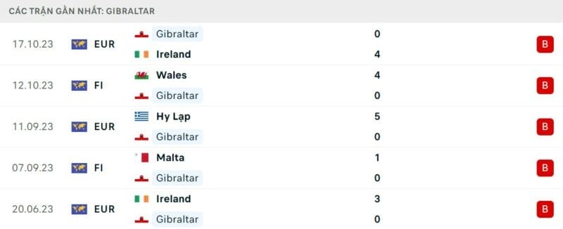 Trong khi đó, thành tích thi đấu của Gibraltar lại trái ngược hoàn toàn so với đối thủ của mình. Họ chưa thắng trận nào tại vòng loại Euro 2024, và thậm chí còn chưa ghi nổi dù chỉ 1 bàn thắng. Đây là kịch bản quen thuộc với đội tuyển thuộc diện yếu nhất tại Châu Âu.