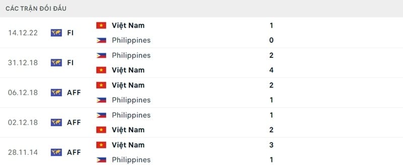 Thành tích đối đầu Philippines vs Việt Nam