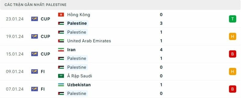 Palestine cho thấy họ xứng đáng góp mặt ở vòng đấu loại trực tiếp. Tuy nhiên, thành tích đối đầu giữa đôi bên lại không hề ủng hộ đội bóng này. Cụ thể, các vị khách đã không thể thắng bất kỳ trận nào trong 6 lần đụng độ Qatar trước đây và thậm chí phải chịu 5 thất bại.