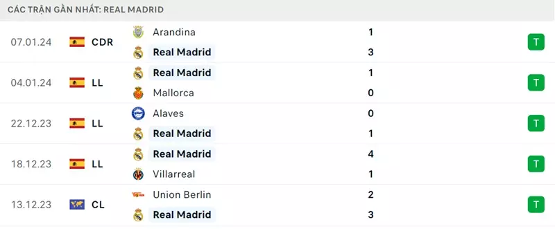 Mùa giải của Real Madrid đang đi đúng hướng. Họ hiện dẫn đầu La Liga, tiến vào vòng 1/8 Champions League với thành tích toàn thắng và chuẩn bị tập trung vào nhiệm vụ chinh phục Siêu cúp Tây Ban Nha trên đất Ả Rập. Phong độ của Los Blancos gần đây là rất ấn tượng. Họ thiết lập chuỗi 5 trận thắng trên mọi đấu trường.