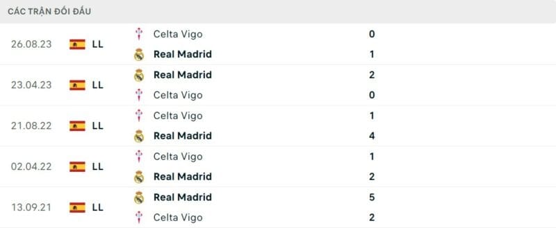 Thành tích đối đầu Real Madrid vs Celta Vigo